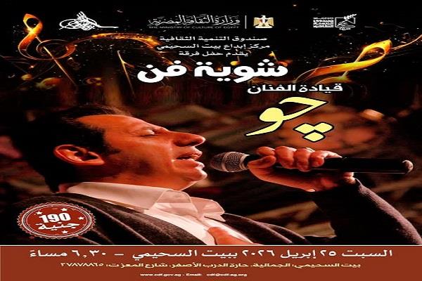يقيم مركز إبداع بيت السحيمي بشارع المعز، التابع لقطاع صندوق التنمية الثقافية، أمسية فنية تحييها فرقة "شوية فن" بقيادة الفنان جو، وذلك اليوم السبت الموافق 25 أبريل، في تمام الساعة السادسة والنصف مساءً.