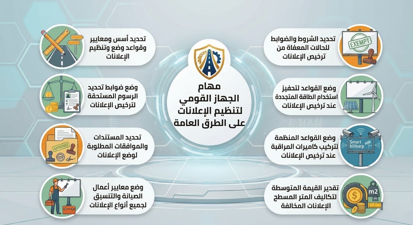 من الجدير بالذكر، أن الجهاز القومي لتنظيم الإعلانات على الطرق العامة التابع لرئاسة مجلس الوزراء، أُنشئ بقرار رئيس مجلس الوزراء رقم 1440 لسنة 2022، ويترأس مجلس إدارته رئيس مجلس الوزراء أو من ينيبه، ويضم في عضويته عدداً من الوزراء المعنيين، ويتولى وزير الإسكان والمرافق والمجتمعات العمرانية “مقرر المجلس” إصدار القرارات المنظمة لتشكيل الأمانة الفنية ونظام عملها، فيما يتم تعيين الرئيس التنفيذي للجهاز ونائبه بقرار من رئيس مجلس الوزراء بناءً على ترشيح وزير الإسكان.