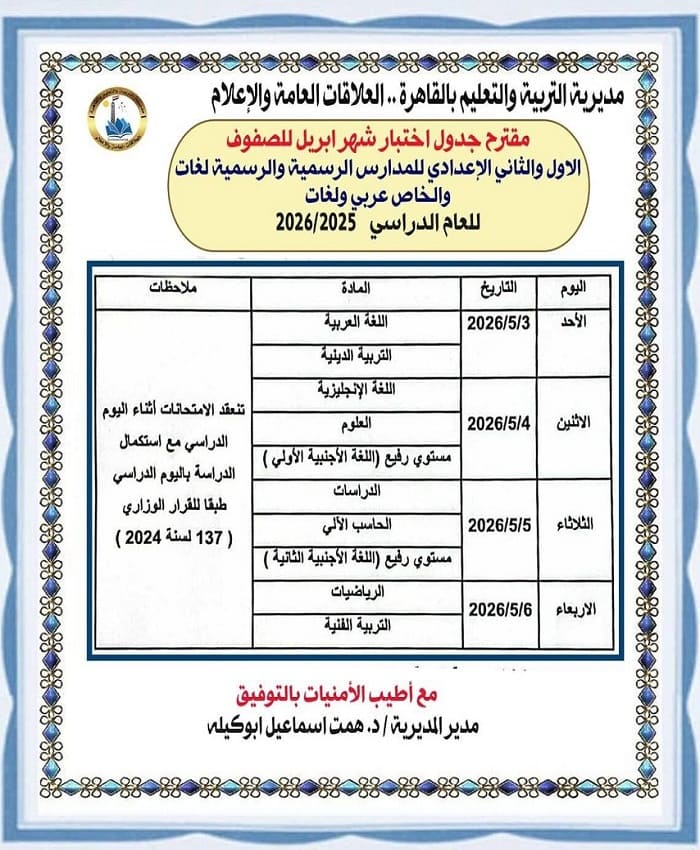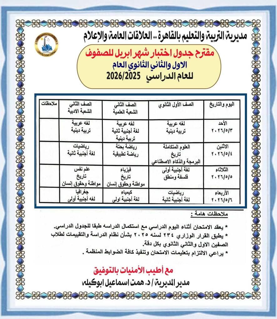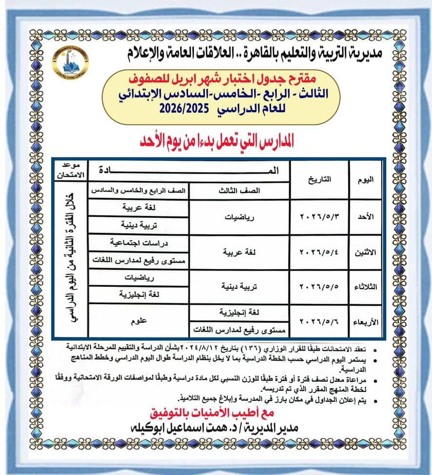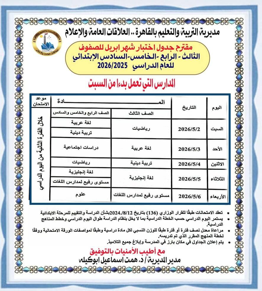وأعلنت مديرية التربية والتعليم بالقاهرة عن طرح مقترح جداول امتحانات شهر أبريل لصفوف النقل بمراحل التعليم الثلاث (الابتدائية – الإعدادية – الثانوية) للعام الدراسي ٢٠٢٦/٢٠٢٥.