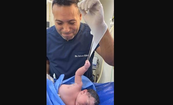 وفي محاولة من الطبيب لتخفيف قبضة الرضيع، قام بدغدغته، إلا أن رد فعل الطفل كان عفويًا وممزوجًا بالبكاء، مع استمراره في التمسك بالقفاز.