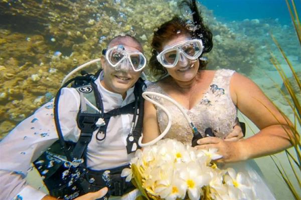 في خطوة غير تقليدية، قرر زوجان الاحتفال بزفافهما بشكل غير تقليدي تحت سطح البحر، في منطقة “كاب مالوريو” شمال موريشيوس، في شرق إفريقيا ، تعبيرًا عن شغفهما المشترك بهواية الغوص التي جمعتهما طوال 12 عامًا.