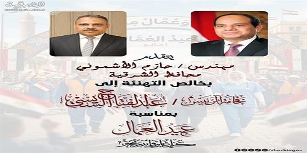 بعث المهندس حازم الأشموني محافظ الشرقية برقية تهنئة لفخامة الرئيس عبد الفتاح السيسي رئيس الجمهورية بمناسبة الإحتفال بعيد العمال جاء فيها «يسعدني ويشرفني أن أرفع لفخامتكم بالأصالة عن نفسي وبالإنابة عن أعضاء الجهاز التنفيذي والقيادات العمالية وأبناء المحافظة أسمى آيات التهاني بمناسبة الاحتفال بعيد العمال مايو ٢٠٢٦م عيد العمل والعطاء والإنتاج وبهذه المناسبة الغالية، نتوجه للمولي عز وجل أن يعيدها علي فخامتكم بموفور الصحة والعافية، وأن يوفقكم ويرعاكم لما فيه الخير لحرصكم الدائم علي حماية مصالح العمال والتأكيد على دورهم في مواصلة مسيرة العمل والتنمية .