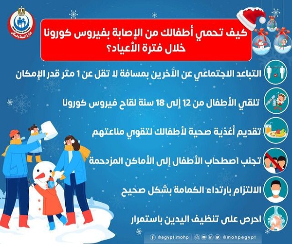 بالتزامن مع انطلاق احتفالات الكنائس بالكريسماس، والتي تستمر حتى ليلة رأس السنة 31 ديسمبر، ما يحتم تشديد الإجراءات الاحترازية، تجنبًا لحدوث طفرة في أعداد الإصابة اليومية بفيروس كورونا، أصدرت وزارة الصحة والسكان مجموعة نصائح لحماية الأطفال من الإصابة بفيروس كورونا، خلال فترة الأعياد، خاصًة وأنها تأتي في ظل الطقس البارد والذي يكثر به انتشار الأوبئة والفيروسات، وجاءت نصائح الصحة كالآتي:
