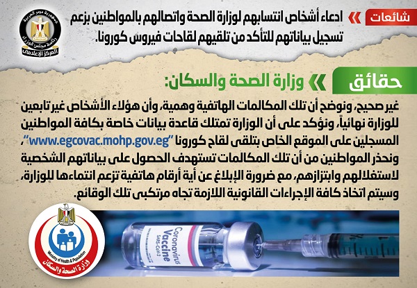 وأكدت أن الوزارة تمتلك قاعدة بيانات خاصة بكافة المواطنين المسجلين على الموقع الخاص بتلقي لقاح كورونا "www.egcovac.mohp.gov.eg"، محذرة المواطنين من أن تلك المكالمات تستهدف الحصول على بياناتهم الشخصية لاستغلالهم وابتزازهم، مع ضرورة الإبلاغ عن أية أرقام هاتفية تزعم انتماءها للوزارة، وسيتم اتخاذ كافة الإجراءات القانونية اللازمة تجاه مرتكبي تلك الوقائع.