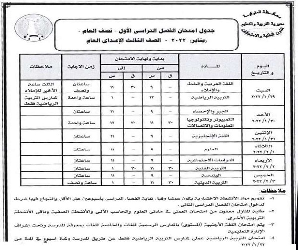 وفيما يلي جداول امتحانات منتصف العام الدراسي للشهادة الإعدادية في عدد من محافظات مصر: