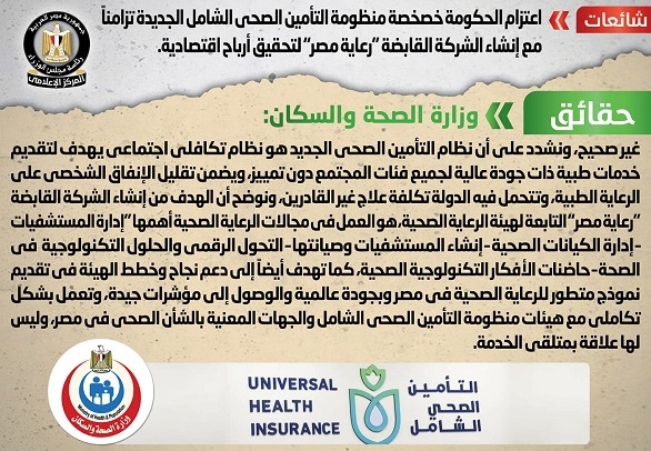 وتواصل المركز الإعلامي لمجلس الوزراء، مع وزارة الصحة والسكان، والتي نفت تلك الأنباء، مُؤكدةً أنه لا صحة لخصخصة منظومة التأمين الصحي الشامل الجديدة، مُشددةً على أن نظام التأمين الصحي الجديد هو نظام تكافلي اجتماعي يهدف لتقديم خدمات طبية ذات جودة عالية لجميع فئات المجتمع دون تمييز، ويضمن تقليل الإنفاق الشخصي على الرعاية الطبية، وتتحمل فيه الدولة تكلفة علاج غير القادرين، مُوضحةً أن الهدف من إنشاء الشركة القابضة "رعاية مصر" التابعة لهيئة الرعاية الصحية، هو العمل في مجالات الرعاية الصحية أهمها "إدارة المستشفيات – إدارة الكيانات الصحية – إنشاء المستشفيات وصيانتها – التحول الرقمي والحلول التكنولوجية في الصحة – حاضنات الأفكار التكنولوجية الصحية، كما تهدف أيضاً إلى دعم نجاح وخطط الهيئة في تقديم نموذج متطور للرعاية الصحية في مصر وبجودة عالمية والوصول إلى مؤشرات جيدة، وتعمل بشكل تكاملي مع هيئات منظومة التأمين الصحي الشامل والجهات المعنية بالشأن الصحي في مصر، وليس لها علاقة بمتلقي الخدمة.